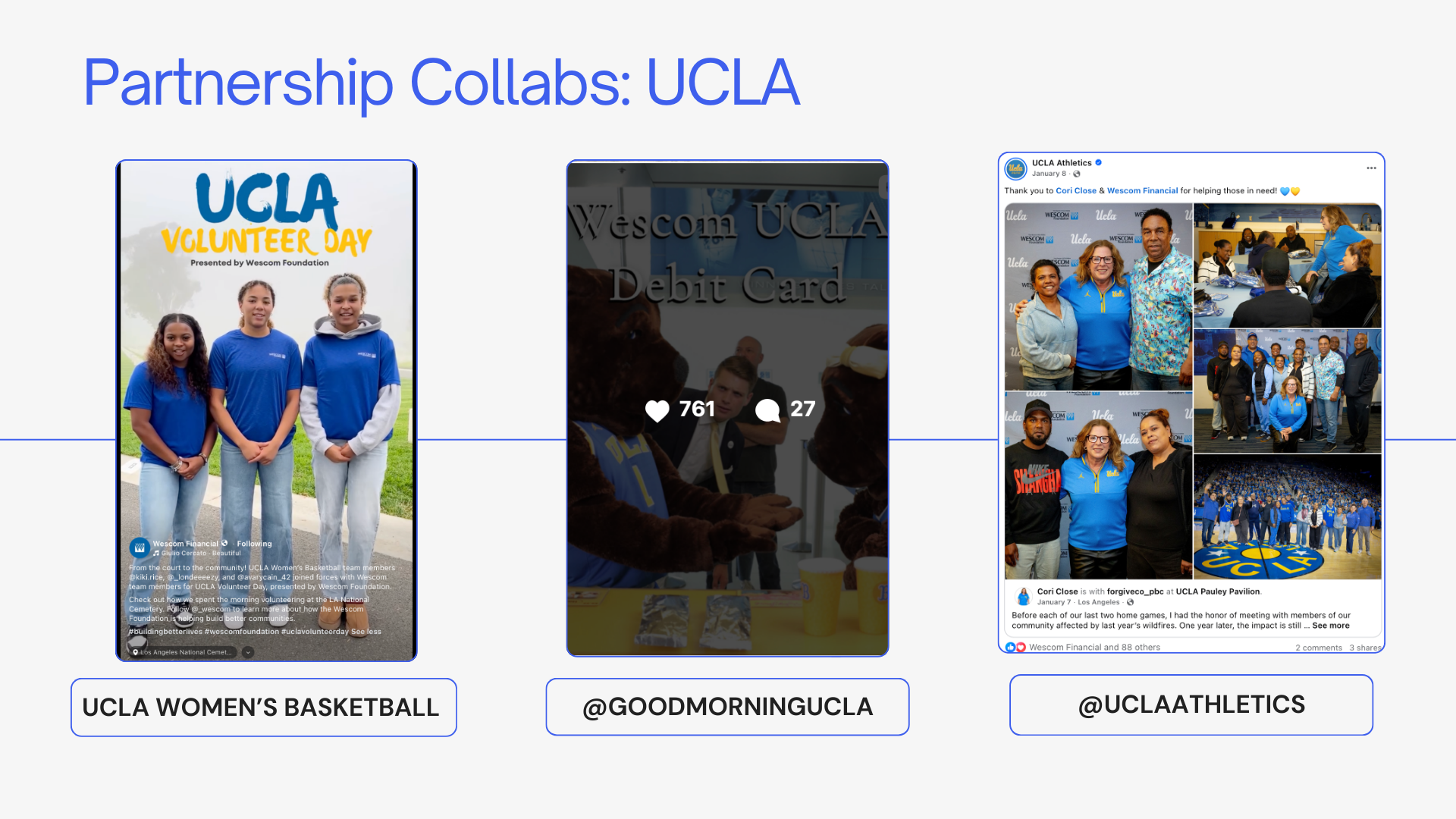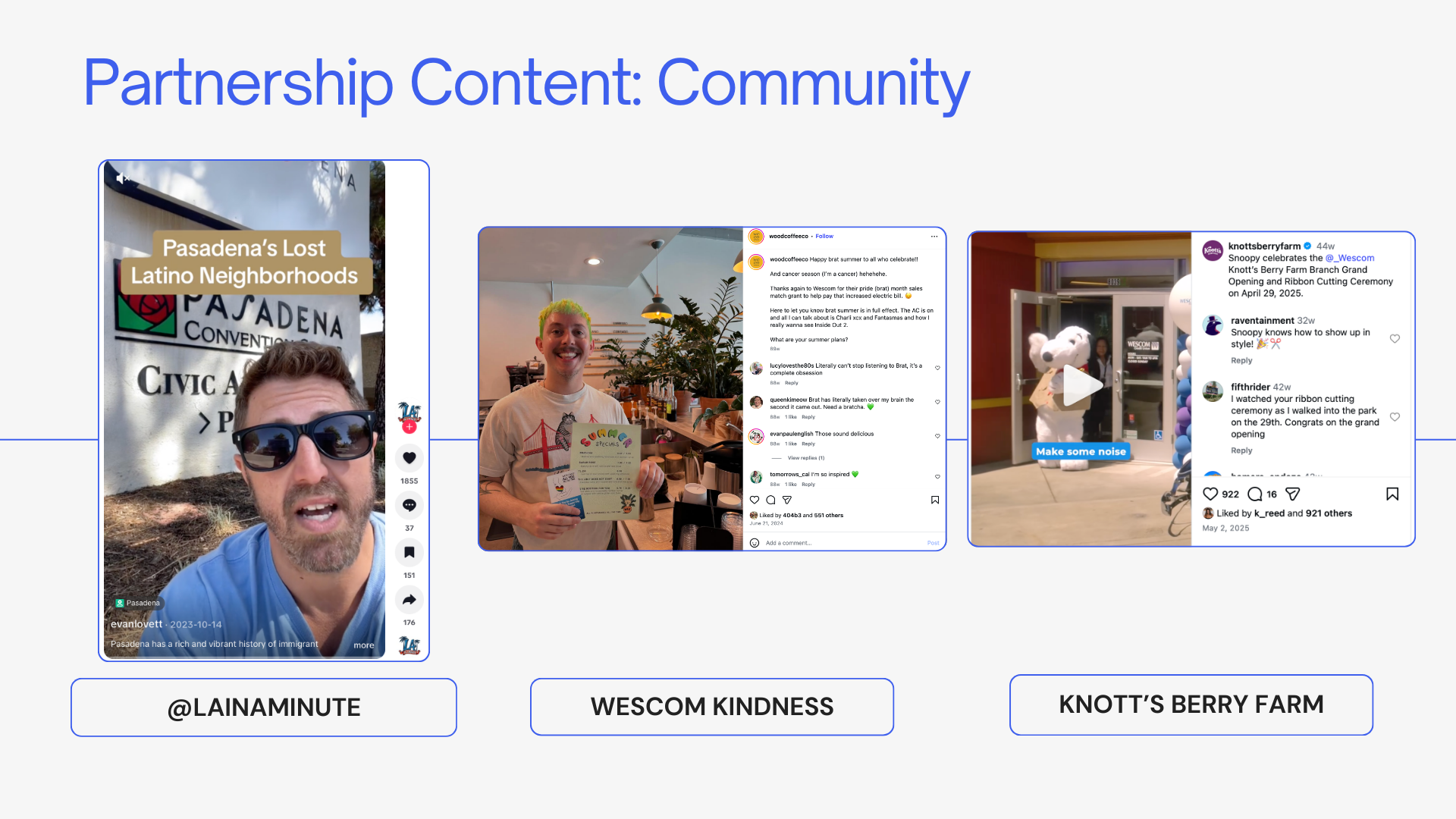 Wescom: framework, outreach, contracts, creative guidelines, and performance benchmarks Wescom collabs: content strategy, filming, photography, editing, compliance review, coordinating with internal/external partners Wescom Collabs: content strategy, contracts, compliance review Wescom video: content strategy, filming, editing, copy Wescom: copy, content and community management